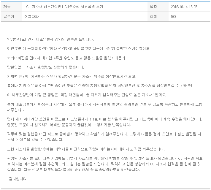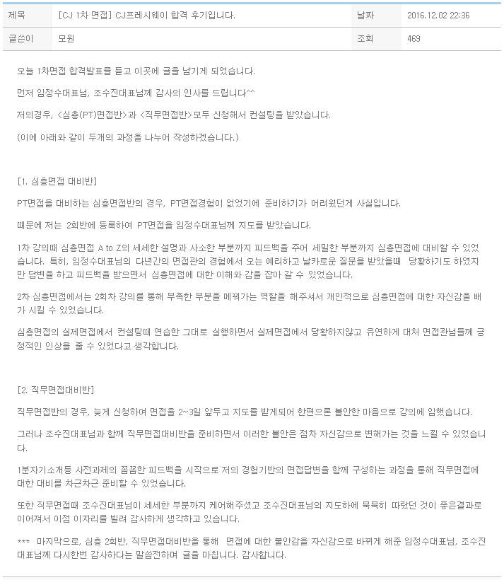 오늘 1차면접 합격발표를 듣고 이곳에 글을 남기게 되었습니다. 먼저 임정수대표님, 조수진대표님께 감사의 인사를 드립니다^^저의경우, 과 모두 신청해서 컨설팅을 받았습니다.(이에 아래와 같이 두개의 과정을 나누어 작성하겠습니다.) [1. 심층면접 대비반]PT면접을 대비하는 심층면접반의 경우, PT면접경험이 없었기에 준비하기가 어려웠던게 사실입니다.때문에 저는 2회반에 등록하여 PT면접을 임정수대표님께 지도를 받았습니다. 1차 강의때 심층면접 A to Z의 세세한 설명과 사소한 부분까지 피드백을 주어 세밀한 부분까지 심층면접에 대비할 수 있었습니다.특히, 임정수대표님의 다년간의 면접관의 경험에서 오는 예리하고 날카로운 질문을 받았을때 당황하기도 하였지만 답변을 하고 피드백을 받으면서 심층면접에 대한 이해와 ..