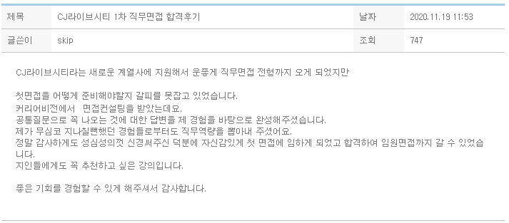 CJ라이브시티라는 새로운 계열사에 지원해서 운좋게 직무면접 전형까지 오게 되었지만 첫면접을 어떻게 준비해야할지 갈피를 못잡고 있었습니다. 커리어비전에서 면접컨설팅을 받았는데요.공통질문으로 꼭 나오는 것에 대한 답변을 제 경험을 바탕으로 완성해주셨습니다.제가 무심코 지나칠뻔했던 경험들로부터도 직무역량을 뽑아내 주셨어요. 정말 감사하게도 성심성의껏 신경써주신 덕분에 자신감있게 첫 면접에 임하게 되었고 합격하여 임원면접까지 갈 수 있었습니다. 지인들에게도 꼭 추천하고 싶은 강의입니다. 좋은 기회를 경험할 수 있게 해주셔서 감사합니다. ㅡㅡㅡㅡㅡㅡㅡㅡㅡㅡㅡㅡㅡㅡㅡㅡㅡㅡㅡㅡㅡㅡ홈페이지 리뉴얼로 기존 글을 택스트 복사 및 캡쳐 방식으로 옮겼습니다.아래 캡쳐본을 누르시면 원본을 더 선명하게 내용을 확인하실 수..