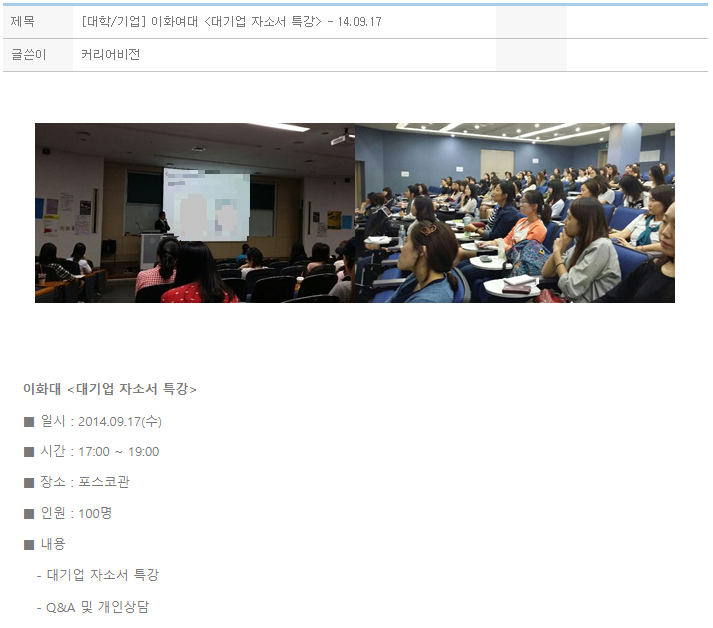 이화여대 <대기업 자소서 특강> 이화대 ■ 장소 : 포스코관■ 인원 : 100명■ 내용- 대기업 자소서 특강- Q&A 및 개인상담 ㅡㅡㅡㅡㅡㅡㅡㅡㅡㅡㅡㅡㅡㅡㅡㅡㅡㅡㅡㅡㅡㅡㅡㅡㅡㅡㅡㅡㅡㅡㅡ 홈페이지 리뉴얼로 기존 글을 캡쳐 방식으로 옮겼습니다. 아래 캡쳐본을 누르시면 더 선명하게 내용을 확인하실 수 있습니다. 기업 l 대학 활동이력 2026.01.17