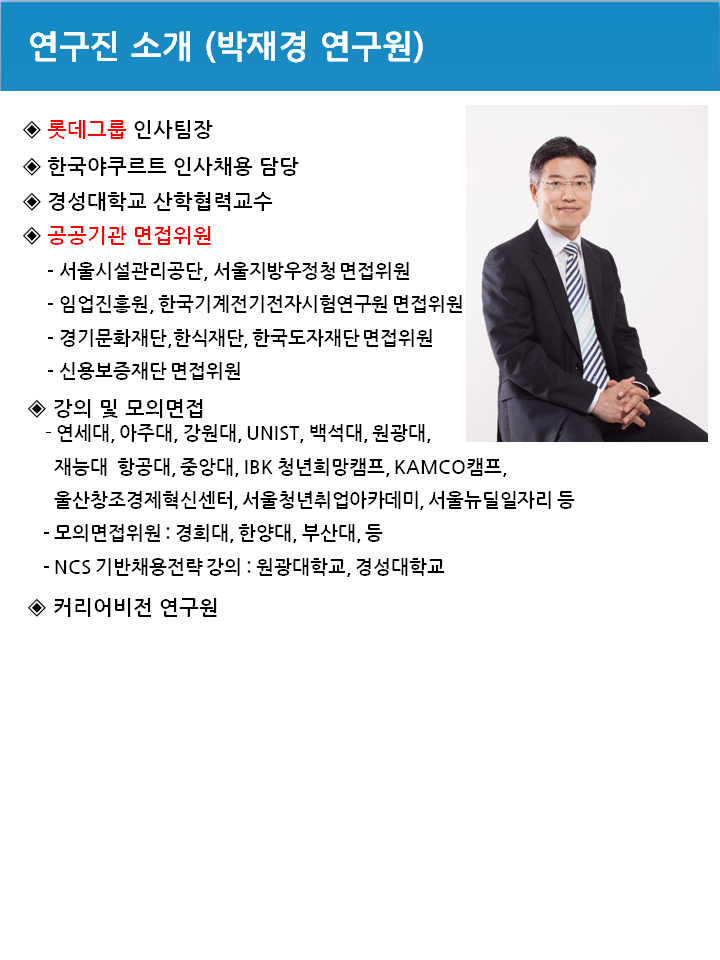 ◈ 現 CareerVision 수석연구원(대표/고문) 現 금융권/공기업 서류전형위원, 외부면접위원 [임정수 대표 언론인터뷰]▶ 아시아투데이 기사 링크 (57초~) : http://www.asiatoday.co.kr/view.php?key=20161214001952453&ref=search [조수진 고문 언론인터뷰]▶ KBS 뉴스 링크 (6분 1초~) : http://news.naver.com/main/read.nhn?mode=LSD&mid=sec&sid1=105&oid=056&aid=0000017693▶ 채널A 뉴스 링크 (1분 13초~) : http://news.ichannela.com/economy/3/01/20131109/58786186/1▶ 단국대 취업프로그램 : http://www.joo..