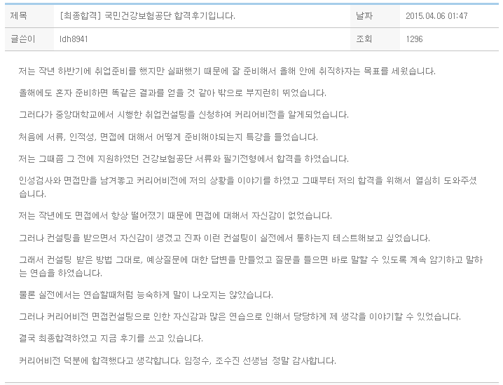 저는 작년 하반기에 취업준비를 했지만 실패했기 때문에 잘 준비해서 올해 안에 취직하자는 목표를 세웠습니다. 올해에도 혼자 준비하면 똑같은 결과를 얻을 것 같아 밖으로 부지런히 뛰었습니다.그러다가 중앙대학교에서 시행한 취업컨설팅을 신청하여 커리어비전을 알게되었습니다. 처음에 서류, 인적성, 면접에 대해서 어떻게 준비해야되는지 특강을 들었습니다. 저는 그때쯤 그 전에 지원하였던 건강보험공단 서류와 필기전형에서 합격을 하였습니다. 인성검사와 면접만을 남겨놓고 커리어비전에 저의 상황을 이야기를 하였고 그때부터 저의 합격을 위해서 열심히 도와주셨습니다. 저는 작년에도 면접에서 항상 떨어졌기 때문에 면접에 대해서 자신감이 없었습니다.그러나 컨설팅을 받으면서 자신감이 생겼고 진짜 이런 컨설팅이 실전에서 통하는지 테스..