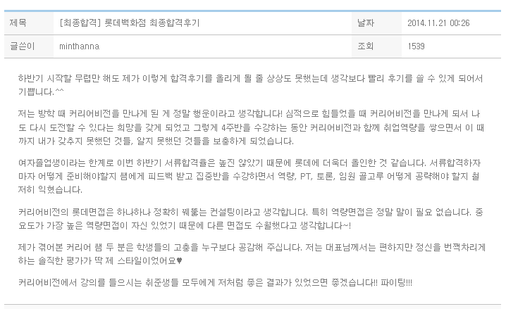 하반기 시작할 무렵만 해도 제가 이렇게 합격후기를 올리게 될 줄 상상도 못했는데 생각보다 빨리 후기를 쓸 수 있게 되어서 기쁩니다.^^ 저는 방학 때 커리어비전을 만나게 된 게 정말 행운이라고 생각합니다! 심적으로 힘들었을 때 커리어비전을 만나게 되서 나도 다시 도전할 수 있다는 희망을 갖게 되었고 그렇게 4주반을 수강하는 동안 커리어비전과 함께 취업역량을 쌓으면서 이 때까지 내가 갖추지 못했던 것들, 알지 못했던 것들을 보충하게 되었습니다. 여자졸업생이라는 한계로 이번 하반기 서류합격율은 높진 않았기 때문에 롯데에 더욱더 올인한 것 같습니다.서류합격하자마자 어떻게 준비해야할지 쌤에게 피드백 받고 집중반을 수강하면서 역량, PT, 토론, 임원 골고루 어떻게 공략해야 할지 철저히 익혔습니다. 커리어비전의..