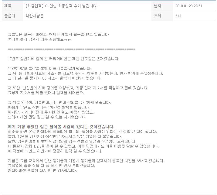 그룹입문 교육은 마쳤고, 현재는 계열사 교육을 받고 있습니다.후기를 늦게 남겨서 너무 죄송해요ㅠㅠ ====================================================================== 17년도 상반기에 알게 된 커리어비전은 제겐 멘토같은 존재였습니다. 우연히 학교 특강을 통해 대표님들을 알게됐습니다.그 뒤, 동기들과 서로의 자소서를 피드백 주면서 취준을 시작했는데, 뭔가 한계에 부딪쳤습니다.그 때 날라온 문자가 CJ 자소서 완벽 대비반? 이었습니다. 저 또한, 반신반의 하며 강의를 수강했고, 가장 먼저 자소서를 작성하고 집에 갔습니다.그렇게 자소서를 제출 했더니 합격을 하더군요. 그 뒤로 인적성, 심층면접, 직무면접 강의를 수강하게 됐습니다.아쉽게 17년도 상반기..