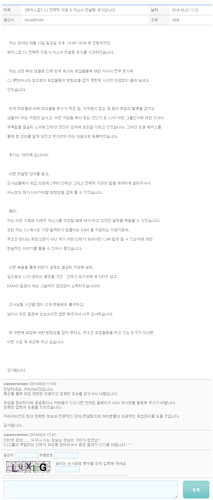 저는 2014년 09월 21일 일요일 오후 13:00~18:00 에 진행되었던,해커스잡 CJ 전략적 지원 & 자소서 컨설팅 후기를 수강하였습니다. 저는 오랜 해외 생활로 인해 한국 회사와 취업활동에 대한 지식이 전무 했기에CJ 뿐만아니라 앞으로의 취업활동의 방향성을 잡지 못한채 시간만 하염없이 흘려 보내고있었습니다. 한국 학생들에 비해 대외활동 횟수가 적은 점, 자격증이 없는 점 등이 취업의 발목을 잡지는않을까? 하는 걱정만 앞서고, 어떤 지원을 해야 맞는 것인가 또 CJ가 어떤 그룹인가에 대한 지식이부족함을 절실히 느끼며 인터넷 엔진의 검색에 모든걸 기대고 있었습니다. 그러던 도중 해커스를통해 본 강의를 알게 되었고 반신반의 하는 마음으로 등록하였습니다. 후기는 '대만족'입니다!!!! 이번 컨설..