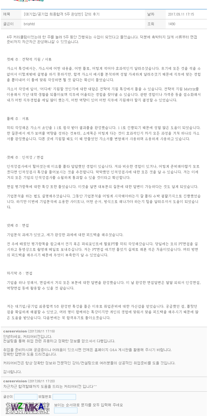 저는 대기업/공기업 최종합격 5주 완성반 특강을 들은 이후로 취업준비에 대한 자신감을 얻었습니다. 궁금했던 점, 몰랐던 점을 확실하게 해결할 수 있었고, 여러 명이 함께하는 특강이지만 개인의 경험에 맞춰서 맞춤 피드백을 해주시기 때문에 많은 도움을 받았습니다. 다음번에는 꼭 합격후기로 돌아오겠습니다.