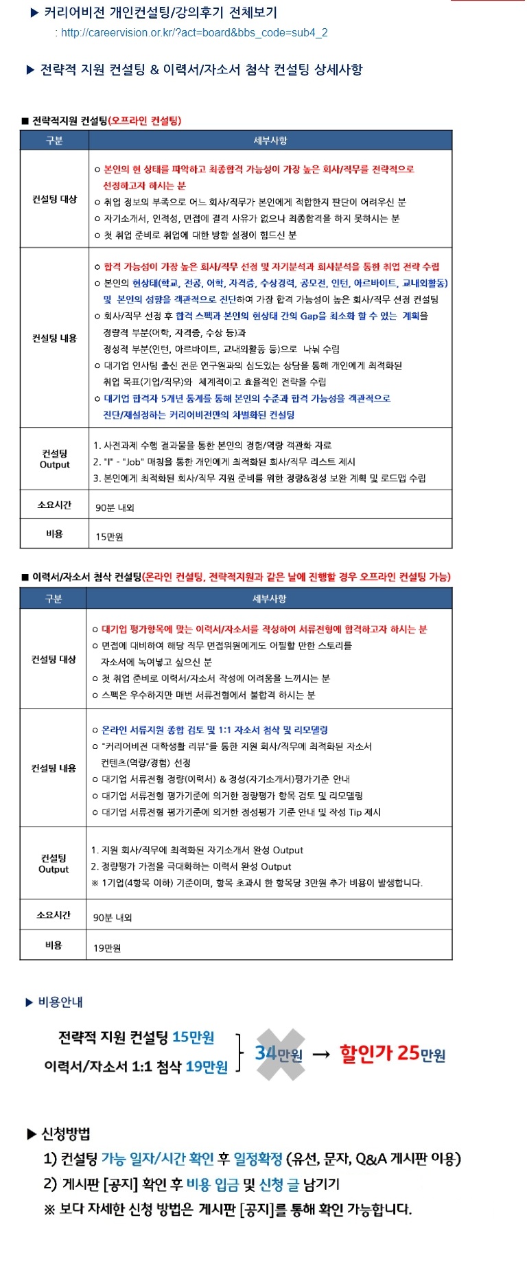 1. 개인 취업프로그램 게시판에 [커리어비전 1:1 개인 취업컨설팅 신청방법 안내] 글이나, 혹은 본 글 댓글에