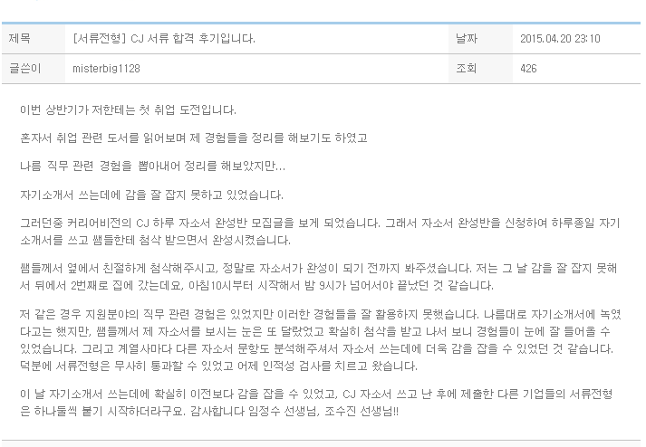 이 날 자기소개서 쓰는데에 확실히 이전보다 감을 잡을 수 있었고, CJ 자소서 쓰고 난 후에 제출한 다른 기업들의 서류전형은 하나둘씩 붙기 시작하더라구요.