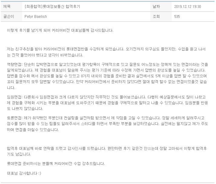 저는 친구추천을 받아 커리어비전의 롯데면접반을 수강하게 되었습니다.