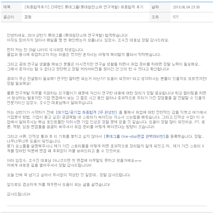 안녕하세요. 2019 상반기 롯데그룹 (롯데첨단소재 연구개발) 합격했습니다!