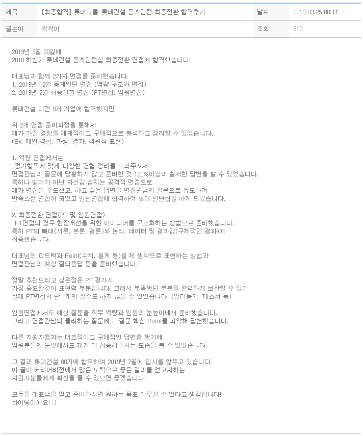 2018 하반기 롯데건설 동계인턴십 최종전환 면접에 합격했습니다!
