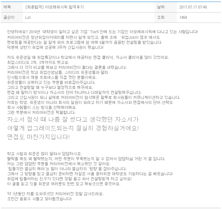 안녕하세요? 2016년 '대학생이 일하고 싶은 기업' Top5 안에 드는 기업인 아모레퍼시픽에 다니고 있는 사람입니다!