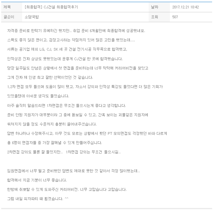 서류는 공기업 제외 LG, CJ, SK 세 곳 건설 전기시공 직무쪽으로 합격했고,