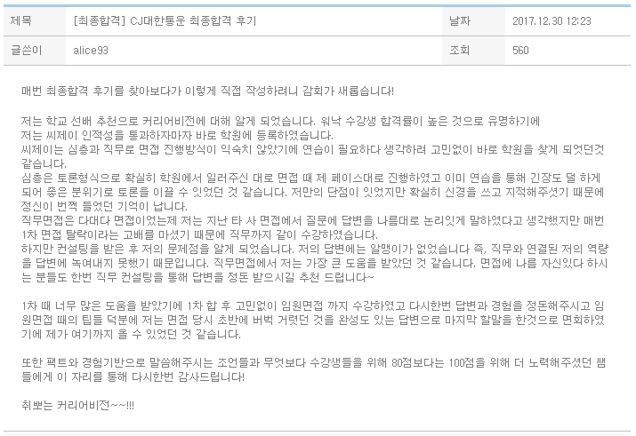 씨제이는 심층과 직무로 면접 진행방식이 익숙치 않았기에 연습이 필요하다 생각하려 고민없이 바로 학원을 찾게 되엇던것 같습니다.