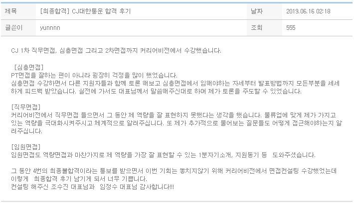 그 동안 4번의 최종불합격이라는 통보를 받으면서 이번 기회는 놓치지않기 위해 커리어비전에서 면접컨설팅 수강했었는데 이렇게 최종합격 후기 남기게 되서 너무 기쁩니다.