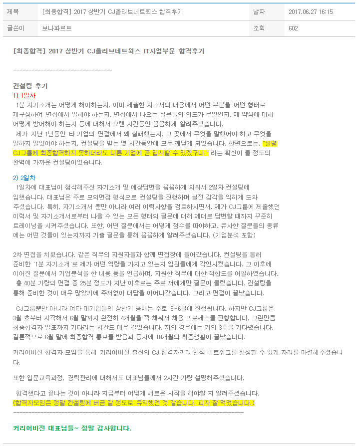 특히, 자기소개서 뿐만 아니라 여러 이력사항을 검토하시면서, 제가 CJ그룹에 제출했던