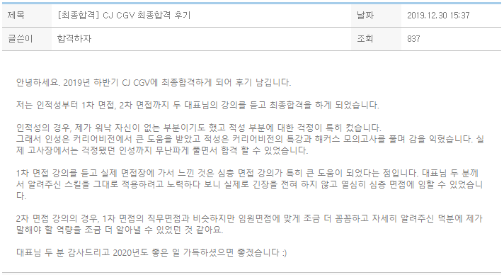 안녕하세요. 2019년 하반기 CJ CGV에 최종합격하게 되어 후기 남깁니다.