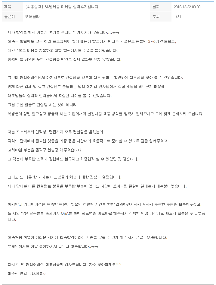 요즘처럼 취업이 어려운 시기에 최종합격이라는 기쁨을 맛볼 수 있게 해주셔서 정말 감사드립니다.