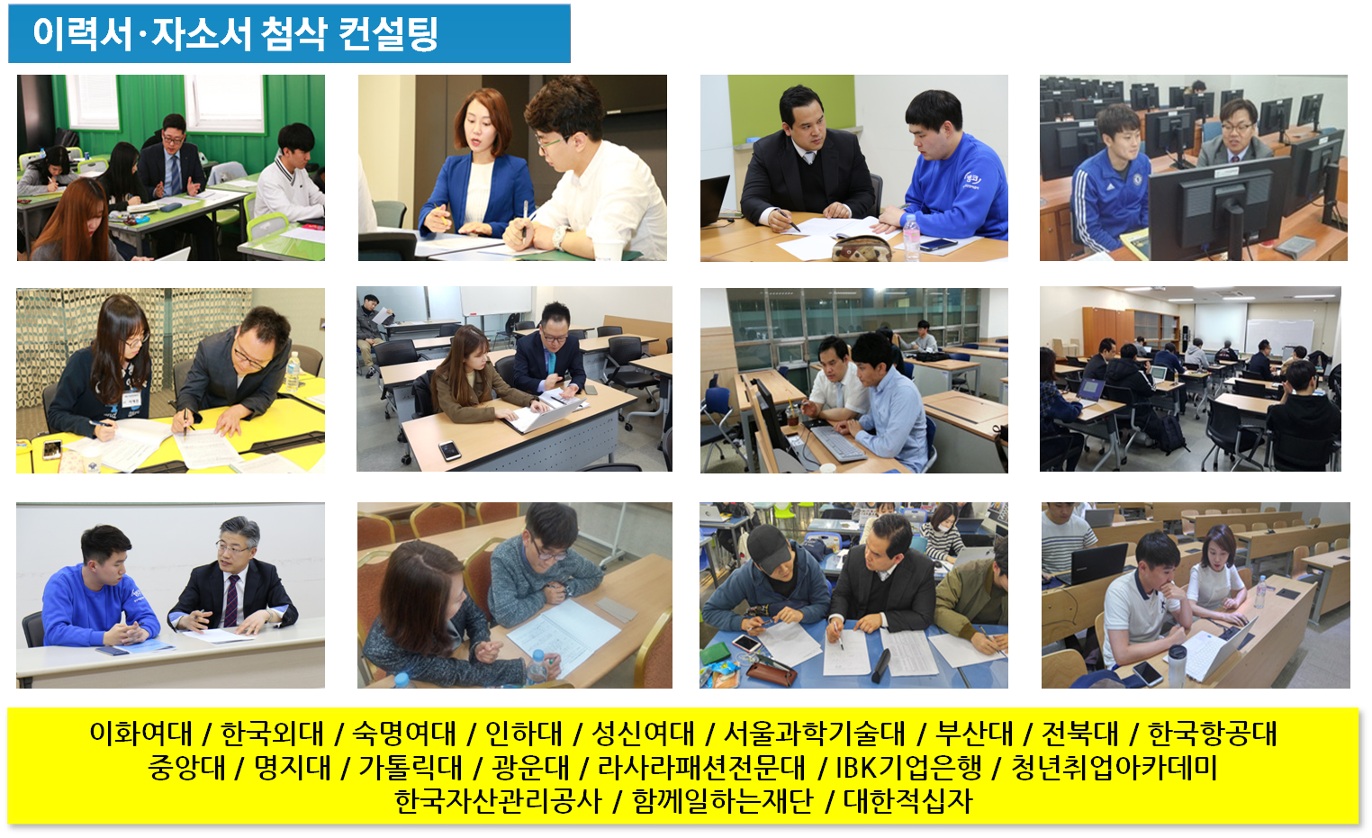 기업/대학 취업프로그램 및 채용대행(서류전형위원, 인적성개발, 외부면접위원)등은 이메일이나 전화로 문의 주시길 바랍니다.