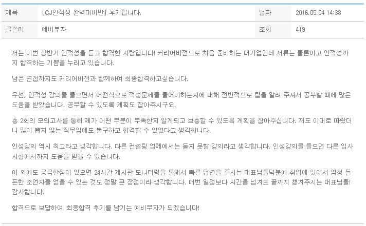 인성강의 역시 최고라고 생각합니다. 다른 컨설팅 업체에서는 듣지 못할 강의라고 생각합니다. 인성강의를 들으면 다른 입사 시험에서까지 도움을 받을 수 있습니다.