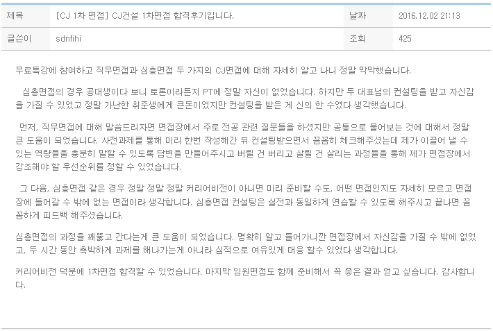 무료특강에 참여하고 직무면접과 심층면접 두 가지의 CJ면접에 대해 자세히 알고 나니 정말 막막했습니다.