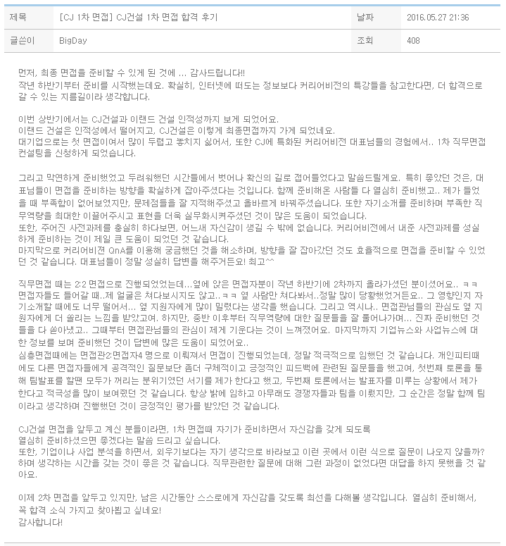 CJ건설 면접을 앞두고 계신 분들이라면, 1차 면접때 자기가 준비하면서 자신감을 갖게 되도록