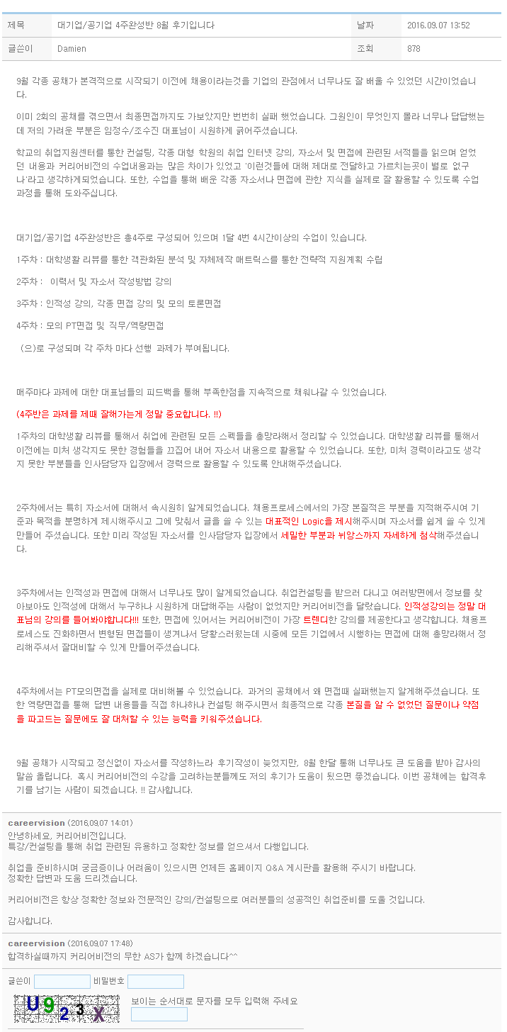 안녕하세요! 2016년 4주반 (2월) 수강생입니다!이전에 커리어비전에서 단과로 컨설팅 받은 적이있어서 처음부터 선생님들을 믿고 수강하기 시작했어요. 그런데 역시나 고퀄리티!! 기대 이상으로 많은 내용을 배워가는 시간이었어요. 1주차)전략적 지원, 자기소개서 작성법전략적 지원 - 예전에는 이 회사는 이 직무 저 회사는 저 직무 이렇게 아무데나 막 지원했었어요. 그런데 강의를 통해서 최대한 합격률을 높일 수 있도록 전략적으로 지원하는 방법을 배웠어요. 저에게 맞는 직무를 찾는 것에서부터 채용공고 분석하는 방법, 제가 가진 경험들을 직무경험으로 활용하는 방법까지 알 수 있어서 유익한 시간이었습니다!자기소개서 작성법 - 자기소개서 항목의 질문의도 파악과 써야할 내용이 무엇인지에 대해서 알 수 있었어요. 배우고..