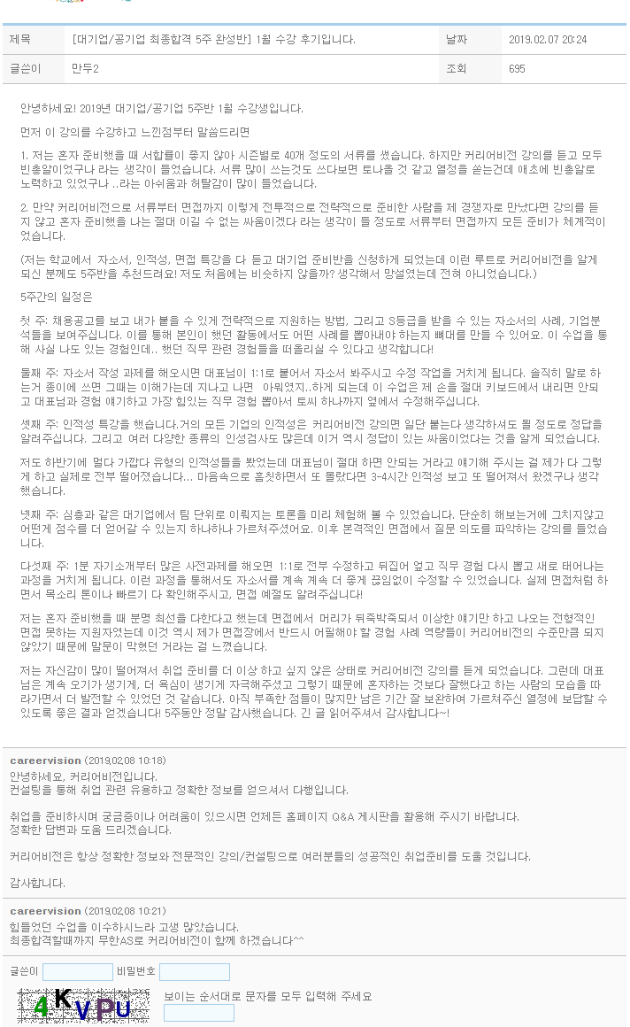 안녕하세요! 2019년 대기업/공기업 5주반 1월 수강생입니다. 먼저 이 강의를 수강하고 느낀점부터 말씀드리면 1. 저는 혼자 준비했을 때 서합률이 좋지 않아 시즌별로 40개 정도의 서류를 썼습니다. 하지만 커리어비전 강의를 듣고 모두 빈총알이었구나 라는 생각이 들었습니다. 서류 많이 쓰는것도 쓰다보면 토나올 것 같고 열정을 쏟는건데 애초에 빈총알로 노력하고 있었구나 ..라는 아쉬움과 허탈감이 많이 들었습니다. 2. 만약 커리어비전으로 서류부터 면접까지 이렇게 전투적으로 전략적으로 준비한 사람을 제 경쟁자로 만났다면 강의를 듣지 않고 혼자 준비했을 나는 절대 이길 수 없는 싸움이겠다 라는 생각이 들 정도로 서류부터 면접까지 모든 준비가 체계적이었습니다.(저는 학교에서 자소서, 인적성, 면접 특강을 다 듣..
