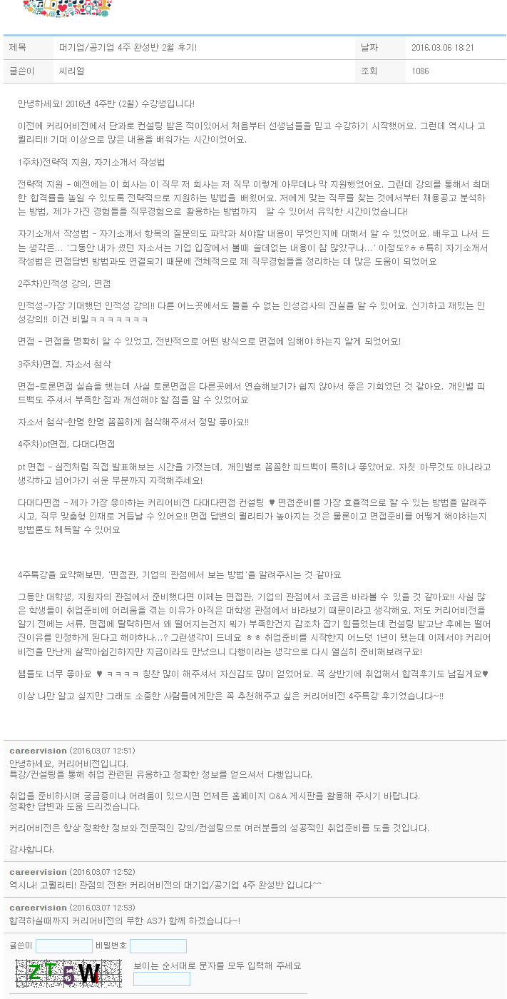 오늘 막 마지막 대략 7시간 가량 이어진 면접컨설팅을 마치고 집에와서 바로 후기씁니다~ 실제 4시간진행인데 한시간 땡겨서 시작했는데도 늦게끝났어요ㅜ,ㅜ 덕분에 진짜 제대로 배우고 왔습니다.4주가 벌써 다갔네요ㅜ.ㅜ 벌써 3월이고 저에게 첫 공채도전이 코앞으로 다가왔습니다. 처음에는 서류광탈하면 어쩌지,라는 생각만 하고 어학성적이나 스팩에 매달렸었는데, 이제는 4주동안 배우고 익힌 자소서,인적성,면접 전반적인 스킬로 인해 한번 해볼만하겠다 라는 확신이 생겼습니다. 저에게 자신감을 주셔서 정말 감사합니다. 저는 작년에 이미 학교에서 실시한 프로그램을 통하여 커리어비전을 접한 상태였습니다. 당시에 입사를 희망하는 기업이 있었는데, 학교 단체 프로그램인데도 불구하고 1:1 개인컨설팅도 해주셨습니다. 정말 열정..