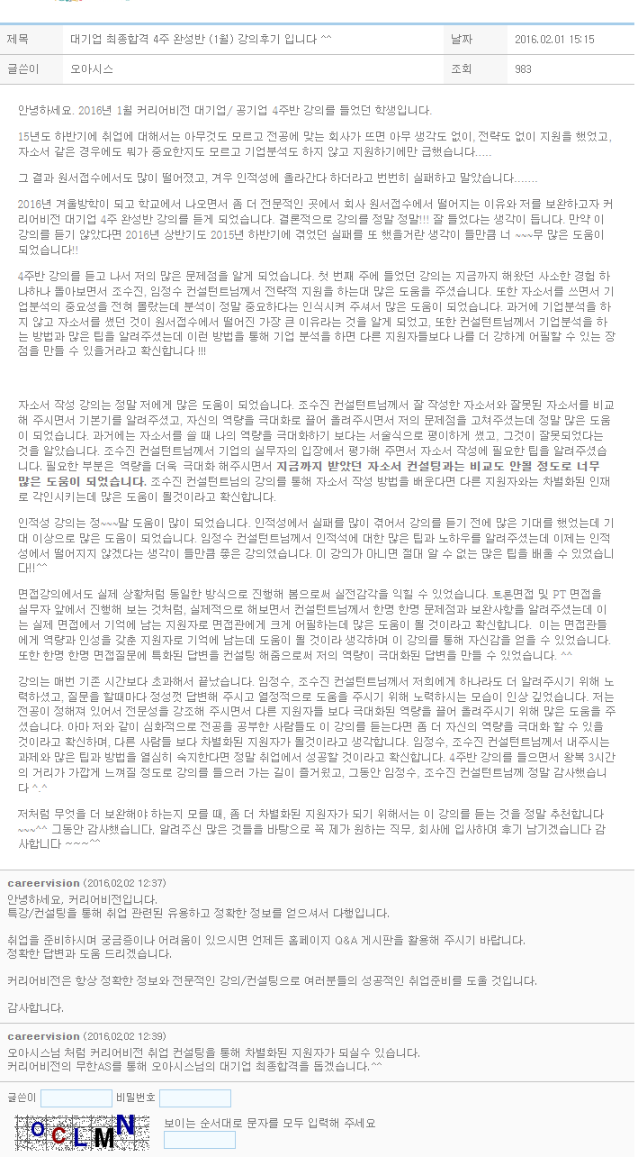 안녕하세요. 2016년 1월 커리어비전 대기업/ 공기업 4주반 강의를 들었던 학생입니다. 15년도 하반기에 취업에 대해서는 아무것도 모르고 전공에 맞는 회사가 뜨면 아무 생각도 없이, 전략도 없이 지원을 했었고, 자소서 같은 경우에도 뭐가 중요한지도 모르고 기업분석도 하지 않고 지원하기에만 급했습니다.....그 결과 원서접수에서도 많이 떨어졌고, 겨우 인적성에 올라간다 하더라고 번번히 실패하고 말았습니다....... 2016년 겨울방학이 되고 학교에서 나오면서 좀 더 전문적인 곳에서 회사 원서접수에서 떨어지는 이유와 저를 보완하고자 커리어비전 대기업 4주 완성반 강의를 듣게 되었습니다.결론적으로 강의를 정말 정말!!! 잘 들었다는 생각이 듭니다. 만약 이 강의를 듣기 않았다면 2016년 상반기도 2015..