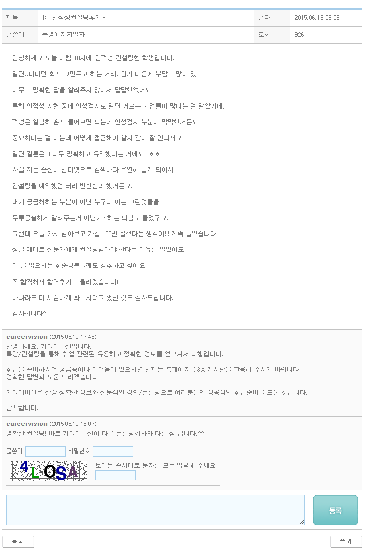 안녕하세요 오늘 아침 10시에 인적성 컨설팅한 학생입니다.^^일단..다니던 회사 그만두고 하는 거라, 뭔가 마음에 부담도 많이 있고아무도 명확한 답을 알려주지 않아서 답답했었어요. 특히 인적성 시험 중에 인성검사로 일단 거르는 기업들이 많다는 걸 알았기에,적성은 열심히 혼자 풀어보면 되는데 인성검사 부분이 막막했거든요.중요하다는 걸 아는데 어떻게 접근해야 할지 감이 잘 안와서요.일단 결론은 !! 너무 명확하고 유익했다는 거에요. ㅎㅎ 사실 저는 순전히 인터넷으로 검색하다 우연히 알게 되어서컨설팅을 예약했던 터라 반신반의 했거든요.내가 궁금해하는 부분이 아닌 누구나 아는 그런것들을두루뭉술하게 알려주는거 아닌가? 하는 의심도 들었구요.그런데 오늘 가서 받아보고 가길 100번 잘했다는 생각이!!! 계속 들었습..