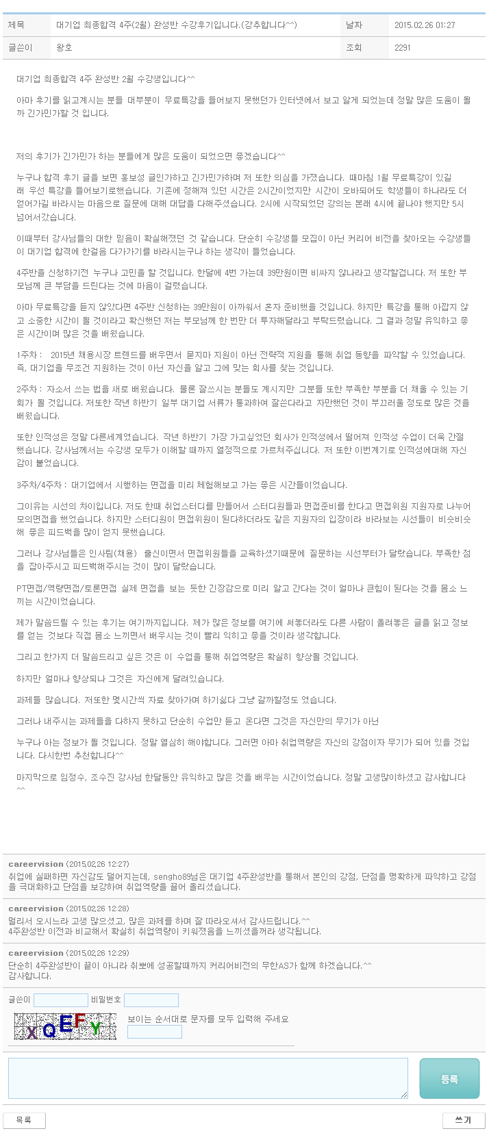 대기업 최종합격 4주 완성반 2월 수강생입니다. 아마 이 후기를 읽으시는 분들은 39만원이라는 부담이 된다면 될 수도 있는 비용 때문에 더 확신을 갖기 위해 읽으실거라 생각이 듭니다. 저 또한 본의아니게 취업 장수생이 되면서 부모님께 부담을 드린다는 것이 마음에 걸렸습니다. 하지만 이 수업을 들으시면 절때 39만원의 강의료가 비싸지 않다는 것이 느껴지실 겁니다!! 첫째, '나'를 정확하게 알게됩니다.내가 부족한 부분이 무엇인지, 어떠한 습관들이 있는지, 잘하는 부분은 어떤 부분인지 정확하게 알게됩니다. 또한 이 부족한 부분들을 보완할 수 있는 방법을 알려주십니다.다들 취업을 하다보면 내가 스펙적으로 어떤 부분이 부족한지 잘 알고 있지만 정작 나에 대해서는 잘 모릅니다. 스펙은 서류 통과할 때만 중요한 부..