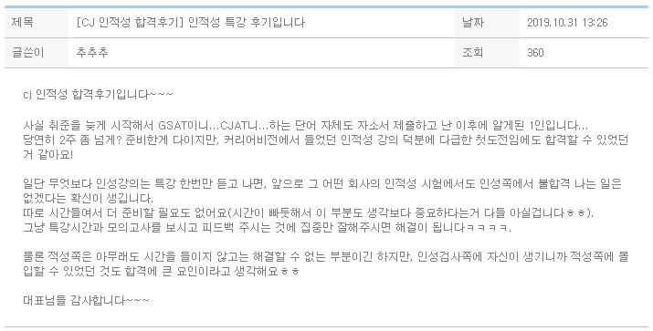 CJ제일제당 1차면접 합격후기입니다.CJ만 2번째 지원인데 이번에 면접이 바뀐다는 소문이 있어서 걱정이었습니다. 커리어비전에서 심층, 직무면접반을 모두 수강하였고 지난번에 제가 왜 떨어졌는지 확실하게 알게되었습니다.잘했다고 생각했지만 많은 실수를 하고 있었다는걸 컨설팅을 받고 알게되었습니다. 더 일찍 알았으면 좋았을걸 ㅠㅠ하지만 이제라도 알게되어 이렇게 합격후기를 쓰니 정말 감사하게 생각합니다.이번에 심층면접이 바뀌었는데 대표님께서는 바뀐면접도 예측해서 알려주셨고 2번에 걸쳐 컨설팅을 받은결과 배운것을 토대로 실전에서 적용하여 합격을 할 수 있었습니다. 직무면접에서는 단순히 어떻게 대답하라가 아니라 학생들 경험을 하나씩 살려 직무에 맞는 답변을 만들어 주셨고면접관 질문의 의도와 개개인별 역량을 연결시켜 ..