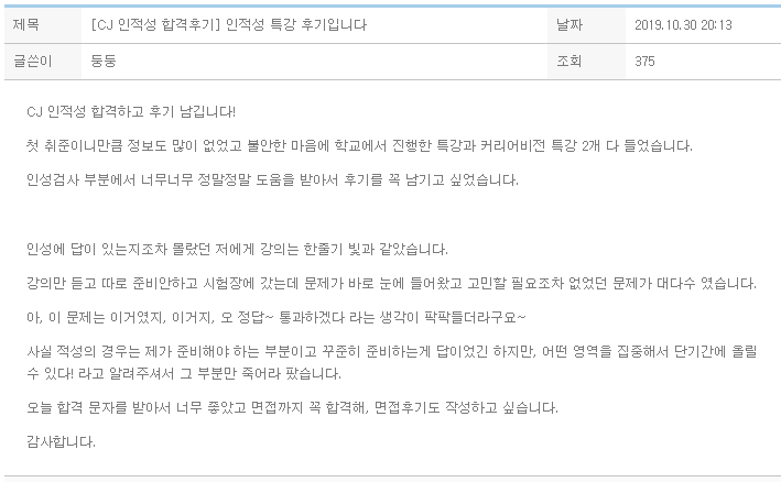 [든든한 취업 페이스 메이커]저는 늦은 나이에 취업시장에 문을 두드리는 취린이입니다.주변 정보도, 물을 곳도 마땅치 않은 상황에서 친구의 추천으로 임정수 대표님을 만나게 됐습니다.자세하고 진심어린 조언으로 서류를 정리할 수 있었고, 겨우 5개 지원한 기업 중 3개가 합격했습니다.그 후에도 물론 AI 역량평가, 직무 fit -test 까지 첫 취준을 준비하는 저는 무엇을 준비할지막막하고 두려웠습니다.그럴 때면, 대표님에게 마음편히 언제든 물을 수 있었고 덕분에 차근차근 빠르게 준비하여다 통과 할 수 있었습니다.커리어비전의 프로그램은 일종의 취업의 든든한 페이스 메이커라는 생각이 듭니다. [인적성의 원리를 가르치는 수업]CJ 인성검사를 앞두고, 또 다시 대표님께 도움을 청했습니다.제가 시간이 잘 나지 않았지..