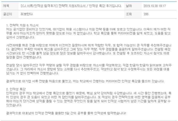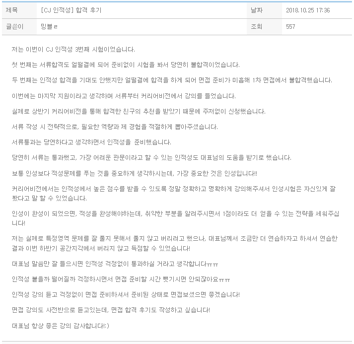 [든든한 취업 페이스 메이커]저는 늦은 나이에 취업시장에 문을 두드리는 취린이입니다.주변 정보도, 물을 곳도 마땅치 않은 상황에서 친구의 추천으로 임정수 대표님을 만나게 됐습니다.자세하고 진심어린 조언으로 서류를 정리할 수 있었고, 겨우 5개 지원한 기업 중 3개가 합격했습니다.그 후에도 물론 AI 역량평가, 직무 fit -test 까지 첫 취준을 준비하는 저는 무엇을 준비할지막막하고 두려웠습니다.그럴 때면, 대표님에게 마음편히 언제든 물을 수 있었고 덕분에 차근차근 빠르게 준비하여다 통과 할 수 있었습니다.커리어비전의 프로그램은 일종의 취업의 든든한 페이스 메이커라는 생각이 듭니다. [인적성의 원리를 가르치는 수업]CJ 인성검사를 앞두고, 또 다시 대표님께 도움을 청했습니다.제가 시간이 잘 나지 않았지..