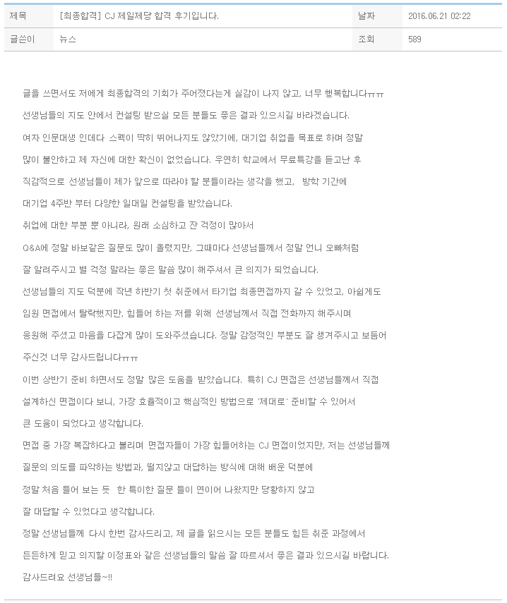 글을 쓰면서도 저에게 최종합격의 기회가 주어졌다는게 실감이 나지 않고, 너무 행복합니다ㅠㅠ 선생님들의 지도 안에서 컨설팅 받으실 모든 분들도 좋은 결과 있으시길 바라겠습니다. 여자 인문대생 인데다 스펙이 딱히 뛰어나지도 않았기에, 대기업 취업을 목표로 하며 정말 많이 불안하고 제 자신에 대한 확신이 없었습니다. 우연히 학교에서 무료특강을 듣고난 후 직감적으로 선생님들이 제가 앞으로 따라야 할 분들이라는 생각을 했고, 방학 기간에 대기업 4주반 부터 다양한 일대일 컨설팅을 받았습니다. 취업에 대한 부분 뿐 아니라, 원래 소심하고 잔 걱정이 많아서 Q&A에 정말 바보같은 질문도 많이 올렸지만, 그때마다 선생님들께서 정말 언니 오빠처럼 잘 알려주시고 별 걱정 말라는 좋은 말씀 많이 해주셔서 큰 의지가..