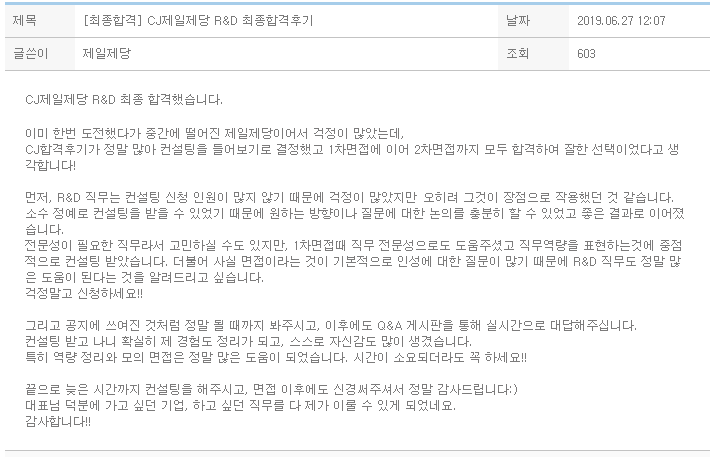 CJ제일제당 R&D 최종 합격했습니다. 이미 한번 도전했다가 중간에 떨어진 제일제당이어서 걱정이 많았는데, CJ합격후기가 정말 많아 컨설팅을 들어보기로 결정했고 1차면접에 이어 2차면접까지 모두 합격하여 잘한 선택이었다고 생각합니다! 먼저, R&D 직무는 컨설팅 신청 인원이 많지 않기 때문에 걱정이 많았지만 오히려 그것이 장점으로 작용했던 것 같습니다.소수 정예로 컨설팅을 받을 수 있었기 때문에 원하는 방향이나 질문에 대한 논의를 충분히 할 수 있었고 좋은 결과로 이어졌습니다.전문성이 필요한 직무라서 고민하실 수도 있지만, 1차면접때 직무 전문성으로도 도움주셨고 직무역량을 표현하는것에 중점적으로 컨설팅 받았습니다. 더불어 사실 면접이라는 것이 기본적으로 인성에 대한 질문이 많기 때문에 R&D 직무도 정말..