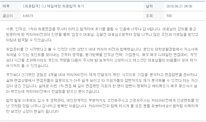 서류, 인적성, 1차와 최종면접을 무사히 마치고 합격하여 후기를 올릴 수 있음에 너무나 감사합니다. 대표님의 강의를 듣고 방문하게 된 커리어비전과의 인연을 통해 임정수 대표님, 김달진 대표님으로부터 정말 너무나 많은 조언과 가르침을 받았고 마침내 합격할 수 있었습니다. 취업준비를 갓 시작했다고 볼 수 있었던 이번 상반기 내내 커리어 비전과 함께했습니다. 본인의 대학생활경험에서 자소서에 녹여낼 수 있는 포인트를 찾아내는 것부터 영역별, 평가항목별 인적성 전략, 기업분석, 매우 매우 디테일한 면접대비, 무엇보다 시간을 초과해서라도 개인의 역량을 다듬어 주시며 밤 늦게까지 고생하시고 애쓰셨던 대표님들의 마음들이 모여 제가 여기까지 올 수 있었습니다. 무엇보다 신기했던 경험은 6개월 내내 커리어비전이 제게 전달..