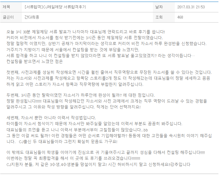안녕하세요.저는 정말 기나긴?취준을 끝내게된 취준생입니다. 커리어비전을 처음 알게된건 일년 반쯤이고, 제대로 커리어비전에서 수업을들은건 이번 학기부터였습니다.오랜기간 취업을 준비하면서 최종합격을 한다는 건 상상만 했었는데, 현실로 이루어지다니 너무 기쁘고 감사합니다.커리어비전이 아니었으면 불가능했을 거에요. 특히 인적성은 커리어비전이 아니면 아마 계속 통과도 못하고 원인도 모른체 나이만 먹었겠죠?씨제이 인적성 세번째 만에 커리어비전을 만나고 합격했습니다. 면접 역시 제가 어떤 부분이 부족하고 어떤 부분을 키워야하는지 딱딱 알려주셔서 정말 도움이 많이 되었습니다.만약 틀에박힌 스터디만을 고집하였다면, 절대 합격하지 못했을꺼에요. 대표님들께 너무 감사드립니다. 특히 면접당일까지 게시판으로 질문에 답변주시고,..