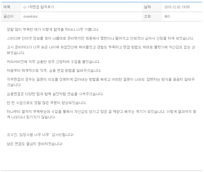 저는 CJ 인적성에 합격하자마자, 특강과 직무면접을 신청했습니다.저는 커리어비전에서 1:1 컨설팅을 받은 경험이 있습니다.커리어비전에서의 ‘두번째’ 컨설팅이었습니다. 저는 상반기에 CJ 1차면접에서 탈락한 경험이 있었습니다.당시 직무면접은 확실히 말아먹었다고 생각하고 있었습니다.그래서 직무면접부터 컨설팅 받아야 겠다는 생각부터 했습니다. 컨설팅 없이 본 상반기에 1차면접 탈컨설팅을 받은 하반기에는 1차면접 합그래서 제 합격은 커리어비전 덕분입니다. 직무면접이 워낙 부족한 상태였기 때문에 직무면접에 집중했지, 직무면접 부분이 좀 덜 부족했다면 심층도 컨설팅 받으며 균형 있게 준비했을 것 같습니다. 사실 심층면접 보기 직전까지도 ‘아 컨설팅 받고 올걸’ 하는 불안감이 있었습니다.저처럼 불안하실 경우에 심층..