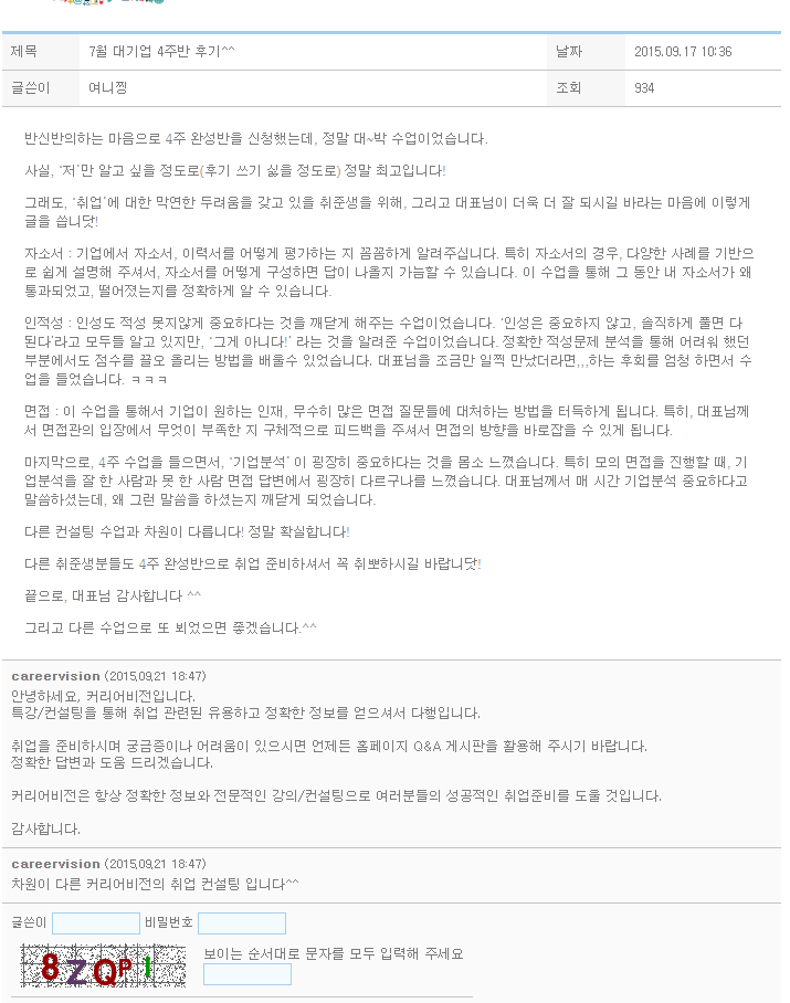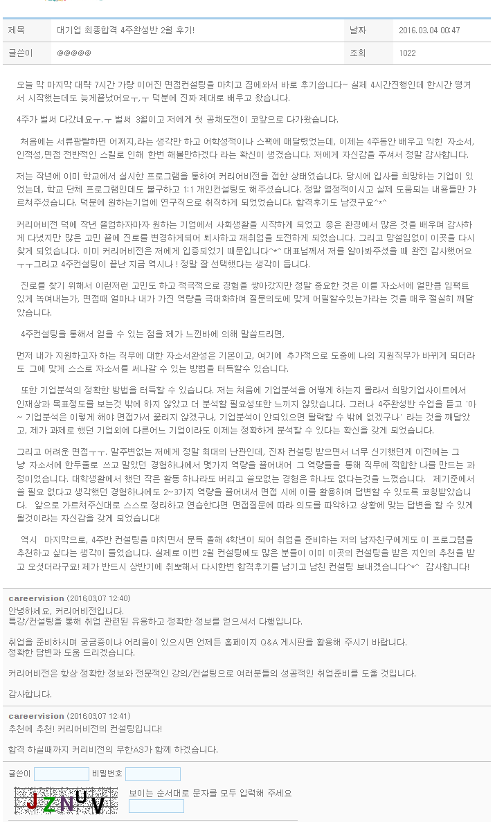 안녕하세요! 2016년 4주반 (2월) 수강생입니다!이전에 커리어비전에서 단과로 컨설팅 받은 적이있어서 처음부터 선생님들을 믿고 수강하기 시작했어요. 그런데 역시나 고퀄리티!! 기대 이상으로 많은 내용을 배워가는 시간이었어요. 1주차)전략적 지원, 자기소개서 작성법전략적 지원 - 예전에는 이 회사는 이 직무 저 회사는 저 직무 이렇게 아무데나 막 지원했었어요. 그런데 강의를 통해서 최대한 합격률을 높일 수 있도록 전략적으로 지원하는 방법을 배웠어요. 저에게 맞는 직무를 찾는 것에서부터 채용공고 분석하는 방법, 제가 가진 경험들을 직무경험으로 활용하는 방법까지 알 수 있어서 유익한 시간이었습니다!자기소개서 작성법 - 자기소개서 항목의 질문의도 파악과 써야할 내용이 무엇인지에 대해서 알 수 있었어요. 배우고..